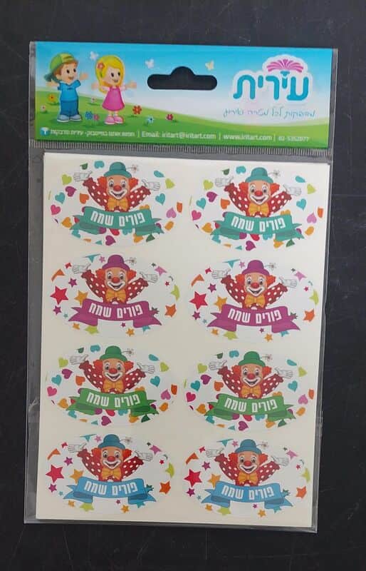 מדבקות פורים שמח ליצן עם עיטורים